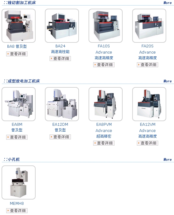 三菱電機(jī)株式會社: 三菱電機(jī)放電加工機(jī)產(chǎn)品有線切割加工機(jī)床,成型放電加工機(jī)床及小孔機(jī)等產(chǎn)品,具體型號BA8 普及型 BA24 高速高性能 FA10S Advance 高速高精度 FA20S Advance 高速高精度 EA8M 普及型 EA12DM 普及型 EA8PVM Advance 超高精密 EA12VM Advance 高速高精度 MEMH8
