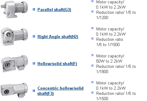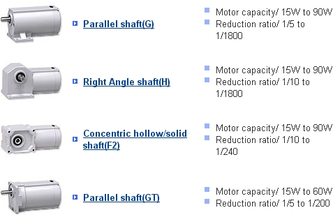Home > Gearmotors > Product List Gearmotor Home (How to find Models and Download Drawings) Product List Gearmotors (6W to 40W) Gearmotors (15W to 90W) Gearmotors (50W to 2.2kW) Inverters (Bundled with Gearmotors) Index Gearmotors (GT-STEP) Bevel Gearboxes (KOMPASS) Servomotor Reducers Servomotor High Precision Reducer Technical Information Technical Documentation Overseas Standard Motors(PDF) Catalogs User User Manuals Catalogs User Manuals Maintenance Information Design Changes Discontinued Models FAQ Contact Gearmotors (6W to 40W) Gearmotors (15W to 90W) Gearmotors (50W to 2.2kW) Inverters (Bundled with Gearmotors) Index Gearmotors (GT-STEP) Bevel Gearboxes (KOMPASS) Servomotor Reducers Servomotor High Precision Reducer Gearmotors (6W to 40W) Parallel shaft(GTR-L) Motor capacity/ 6W to 40W Reduction ratio/ 1/3 to 1/360 Top of page Gearmotors (15W to 90W) Parallel shaft(G) Motor capacity/ 15W to 90W Reduction ratio/ 1/5 to 1/1800 Right Angle shaft(H) Motor capacity/ 15W to 90W Reduction ratio/ 1/10 to 1/1800 Concentric hollow/solid shaft(F2) Motor capacity/ 15W to 90W Reduction ratio/ 1/10 to 1/240 Parallel shaft(GT) Motor capacity/ 15W to 60W Reduction ratio/ 1/5 to 1/200 Top of page Gearmotors (50W to 2.2kW) Parallel shaft(G3) Motor capacity/ 0.1kW to 2.2kW Reduction ratio/ 1/5 to 1/1200 Right Angle shaft(H2) Motor capacity/ 0.1kW to 2.2kW Reduction ratio 1/5 to 1/1500 Hollow/solid shaft(F) Motor capacity/ 50W to 2.2kW Reduction ratio/ 1/5 to 1/1800 Concentric hollow/solid shaft(F3) Motor capacity/ 0.1kW to 2.2kW Reduction ratio/ 1/5 to 1/1500 Top of page Inverters (Bundled with Gearmotors) Inverters Motor capacity/ 0.1kW to 2.2kW Top of page Index Gearmotors (GT-STEP) Parallel shaft Motor capacity/ 25W to 0.2kW No. of stops: 4 to 12 Cycle time (S): 1 to 24 Top of page Bevel Gearboxes (KOMPASS) K/KN type Output shaft diameter: 4 to 40 Reduction ratio/ 1/1 to 1/2 Top of page Servomotor Reducers Precision low-backlash specificationParallel shaft/Right Angle shaft/Hollow/solid shaft/ Concentric hollow/solid shaft Motor capacity/ 100W to 2000W Reduction ratio/ 1/5 to 1/240 Precision 1 arc-min/3 arc-min specificationConcentric hollow/solid shaft Motor capacity/ 100W to 2000W Reduction ratio/ 1/10 to 1/120 Top of page Servomotor Small High Precision Reducer Parallel Shaft/Right Angle Shaft Parallel shaft(AGC) Motor capacity/ 100W to 750W Reduction ratio/ 1/3 to 1/30 Right Angle Shaft(AFC) Motor capacity/ 100W to 750W Reduction ratio/ 1/3 to 1/60