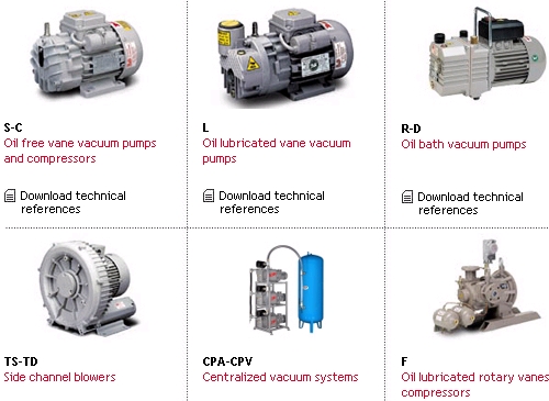 Oil free vane vacuum pumps and compressors Oil lubricated vane vacuum pumps Oil bath vacuum pumps Rocking piston pumps Side channel blowers Centralized vacuum systems Oil lubricated rotary vanes compressors Accessories