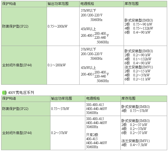 保護(hù)構(gòu)造 輸出功率范圍 電源規(guī)格 庫存范圍 防滴保護(hù)型(IP22) 0.75~200kW 37kW以下 200 / 200-220 V 50/60Hz 45kW以上 200-400 / 200-400 220-440 V 50/60Hz 臥式安裝型(IMB3) 2極 0.75~90 kW 4極 0.75~132kW 6極 0.4~90 kW 全封閉外扇型(IP44) 0.1~200kW 37kW以下 200 / 200-220 V 50/60Hz 45kW以上 200-400 / 200-400 220-440 V 50/60Hz 臥式安裝型(IMB3) 2極 0.2~90 kW 4極 0.1~132kW 6極 0.4~90 kW 法蘭安裝型(IMV1) 2極 0.2~15 kW 4極 0.2~37kW 6極 0.2~11 kW 400V寬電壓系列 保護(hù)構(gòu)造 輸出功率范圍 電源規(guī)格 庫存范圍 防滴保護(hù)型(IP22) 0.75~37kW 380-400-415 /400-440-460V 50/60Hz 臥式安裝型(IMB3) 4極 0.75~37kW 全封閉外扇型(IP44) 0.2~37kW 380-400-415 /400-440-460V 50/60Hz 只有2極 400-415 /400-440-460V 50/60Hz 臥式安裝型(IMB3) 2極 0.2~37 kW 4極 0.2~37kW 6極 0.2~37 kW 法蘭安裝型(IMV1) 4極 0.4~7.5kW